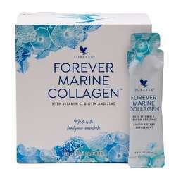 Forever Marine Collagène, ( le collagène marin de Forever) est formulé avec 3000 mg de collagène marin issu de trois poissons, la morue, la goberge et l’églefin facilement assimilable par l’organisme, il contient également des antioxydants de l’extrait de poivre noir, de la vitamine A, C et E, de la biotine et également du zinc.